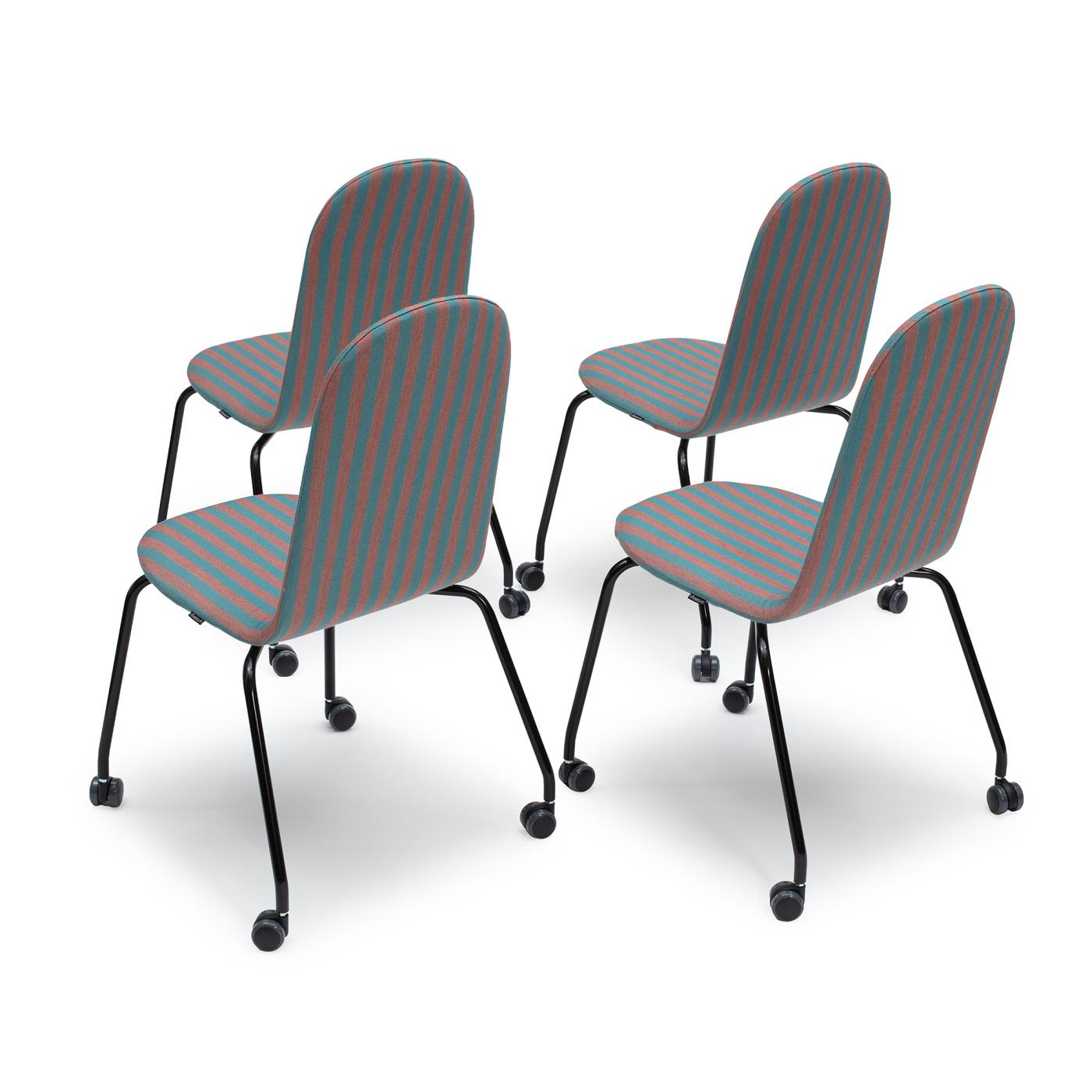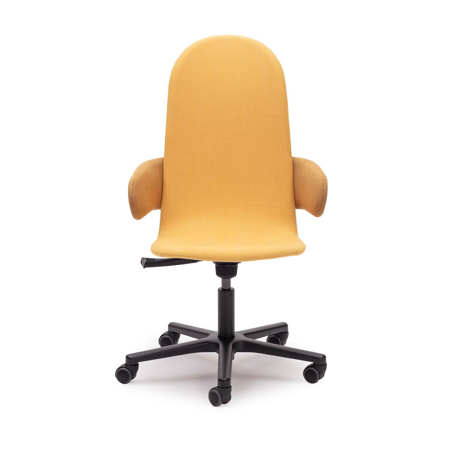 The upholstered Kimono conference chairs are available in 4 different backrest sizes (S, LS, L, H). All (4X and 5X) cross legs are made of Ø 18 mm steel rod and stackable wheeled 4-leg frames are made of 19 mm steel tube. The round shape of the backrests creates a nice rhythm around the table. Both low and high models are available with armrests. The armrests form a straight horizontal line that can be accented with upholstery colors. S and LS backrest sizes also unupholstered and laminated.